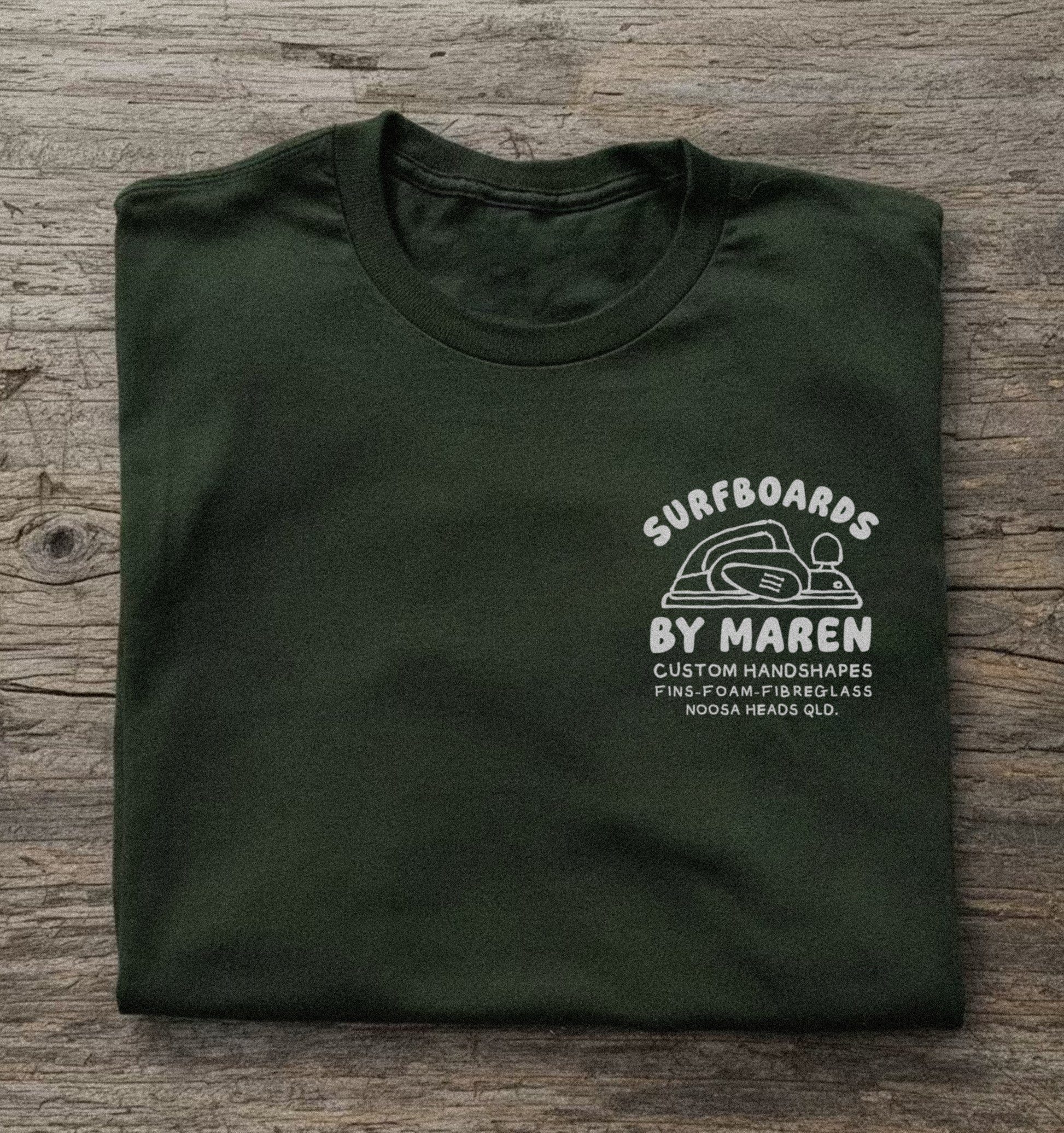Like my surfboards, each T-shirt is hand-printed in my studio with real screens, real ink, and real craft — so every tee has its own little character.